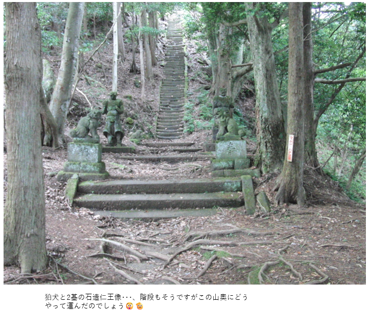 私は3度登っていますが一度もサルと遭遇した事がありません。が、今回ヤマカガシ(毒蛇)と出会いました。ヤマカガシは強力な出血毒を持つ毒蛇です。平野や山間部の標高の低い地域にある水場に生息しています。河川敷や田んぼなど、田舎であれば比較的私たちに身近な場所で見かけることができます。水場に住んでいるのは、餌であるカエルやおたまじゃくし、小型魚類がたくさんいるからです。とくによく狙って食べるのはヒキガエル(ガマガエル)です。ヒキガエルには毒性があるので他のヘビは襲わないのですが、ヤマカガシはむしろ好んで食します。そして、捕食したヒキガエルの毒を体内に貯蓄し、自分の毒として使用するそうです。もう一つ注意したいのがヤマビルです。まだ、被害にあった事はありませんが、忍者のように知らず知らずのうちに忍び寄り、血を吸います。特に雨上がりなどの登山は要注意です。注意と言えば、狛犬の写真にハチとマムシに注意看板もありました。注意点の話が長くなりましたが、山に入る以上、何に遭遇するかわかりません!!注意したいですね!。